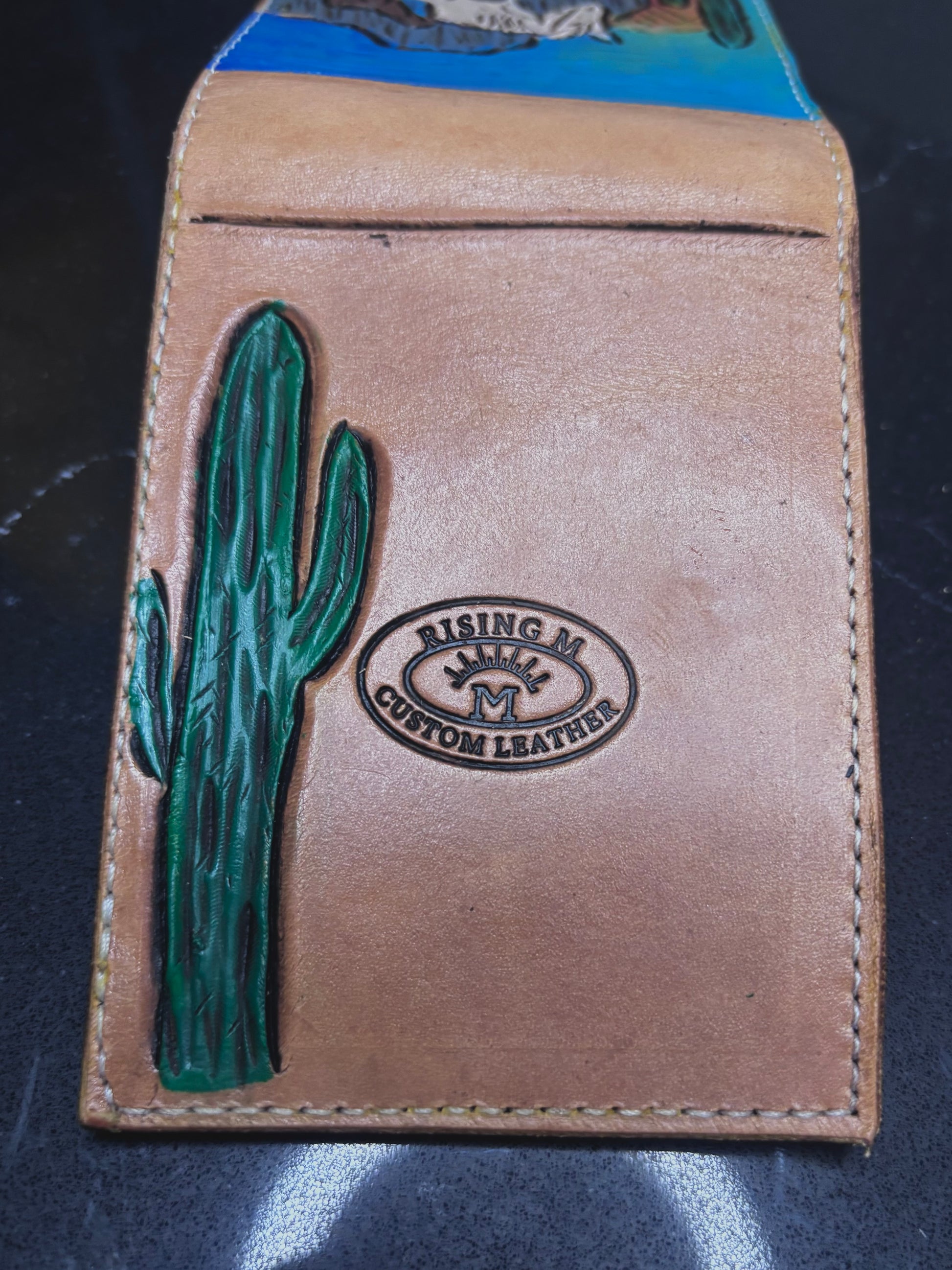 Bold color meets Western soul. This front pocket wallet features a vibrant desert scene showcasing a cowboy and a grey horse, surrounded by cactus and Southwest landscape details. The rich color and detailed tooling give this piece serious visual impact while staying rooted in classic Western craftsmanship.